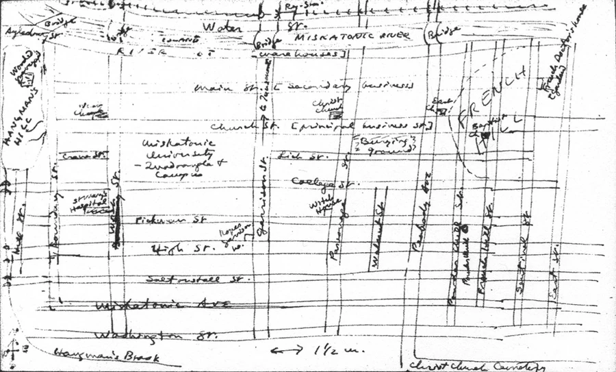 He worked northwest along pleasant back roads, past Hooper’s Pond and the old brick powder-house to where the pastures slope up to the ridge above the Miskatonic and give a lovely vista of Arkham’s white Georgian steeples across leagues of river and meadow. Here he found a shady road to Arkham, but no trail at all in the seaward direction he wished.