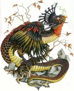 Basilisks resemble some kind of scaled avian, with a sinuous, snake-like tail and expansive wings decorated with bright plumage. Their head sports a striking crest and vicious fangs [2].