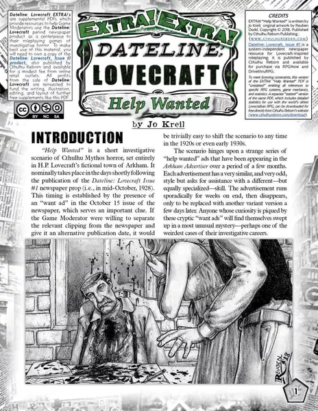 Dateline: Lovecraft EXTRA!: Help Wanted is a system-agnostic gaming supplement for Cthulhu Mythos or Lovecraftian horror roleplaying. Written by Jo Kreil, it was published by Cthulhu Reborn in 2018 as part of their Dateline: Lovecraft series.[1]