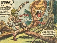 Satha first appeared in Marvel Comics in the adaptation of "The Valley of the Worm" in Supernatural Thrillers #3 (April, 1973). "Scarlet Citadel" was later adapted in Savage Sword of Conan #30. He also appeared in Darkhorse Comics (where?).